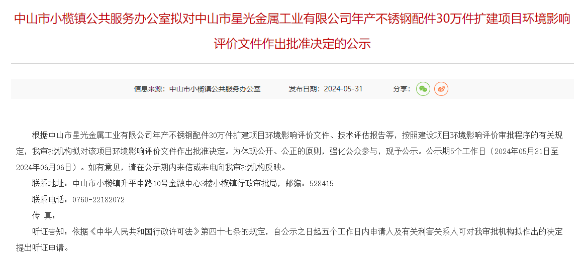 5月31日,中山市小欖鎮公共服務辦公室擬對中山市星光金屬工業有限公司年產不銹鋼配件30萬件擴建項目環境影響評價文件作出批準決定并對外進行公示,公示期:5個工作日(2024年05月31日至2024年06月06日)。
