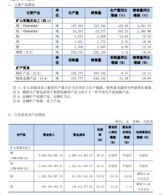 公司鉬、鎢、鈮、磷肥的產(chǎn)量分別為3474噸、1921噸、2506噸和27.88萬(wàn)噸,保持穩(wěn)定或同比增長(zhǎng)。一季度公司銅銷量為12.55萬(wàn)噸,同比增長(zhǎng)43.61倍;鈷銷量2.43萬(wàn)噸,同比增長(zhǎng)23.87倍;鉬、鎢、鈮的銷量分別為3408噸、1773噸、2507噸,同比分別增長(zhǎng)19.52%、18.58%和12.44%;在貿(mào)易端,公司精礦產(chǎn)品銷量為76.93萬(wàn)噸,精煉金屬產(chǎn)品銷量為64.91萬(wàn)噸。
