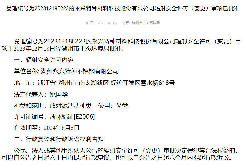 12月18日,湖州永興特種材料科技股份有限公司輻射安全許可(變更)事項獲批準。