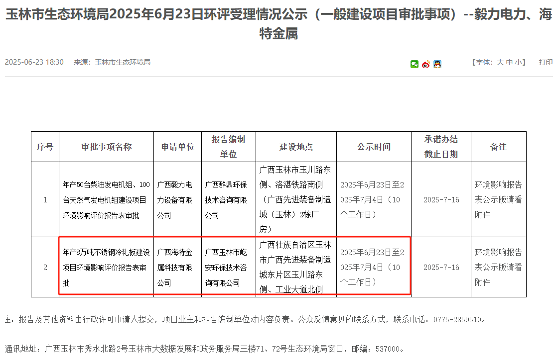 2025年6月23日,廣西玉林市生態(tài)環(huán)境局受理廣西海特金屬科技有限公司年產(chǎn)8萬(wàn)噸不銹鋼冷軋板建設(shè)項(xiàng)目環(huán)境影響評(píng)價(jià)報(bào)告表并對(duì)外進(jìn)行公示,公示時(shí)間:2025年6月23日至2025年7月4日(10個(gè)工作日)。
