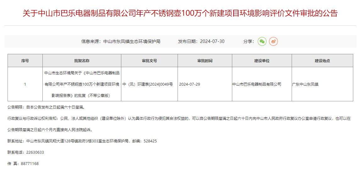 7月30日,中山市東鳳鎮生態環境保護局就中山市巴樂電器制品有限公司年產不銹鋼壺100萬個新建項目環境影響評價文件作出審批意見并對外進行公告,公告期限:自本公告發布之日起滿六十日屆滿。