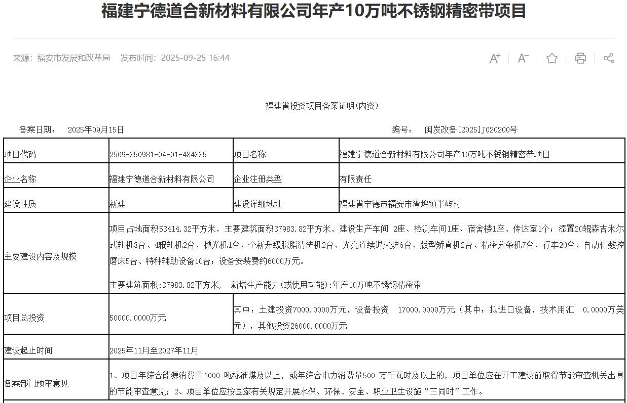 2025年9月15日,福建寧德道合新材料有限公司年產(chǎn)10萬噸不銹鋼精密帶項目獲備案。